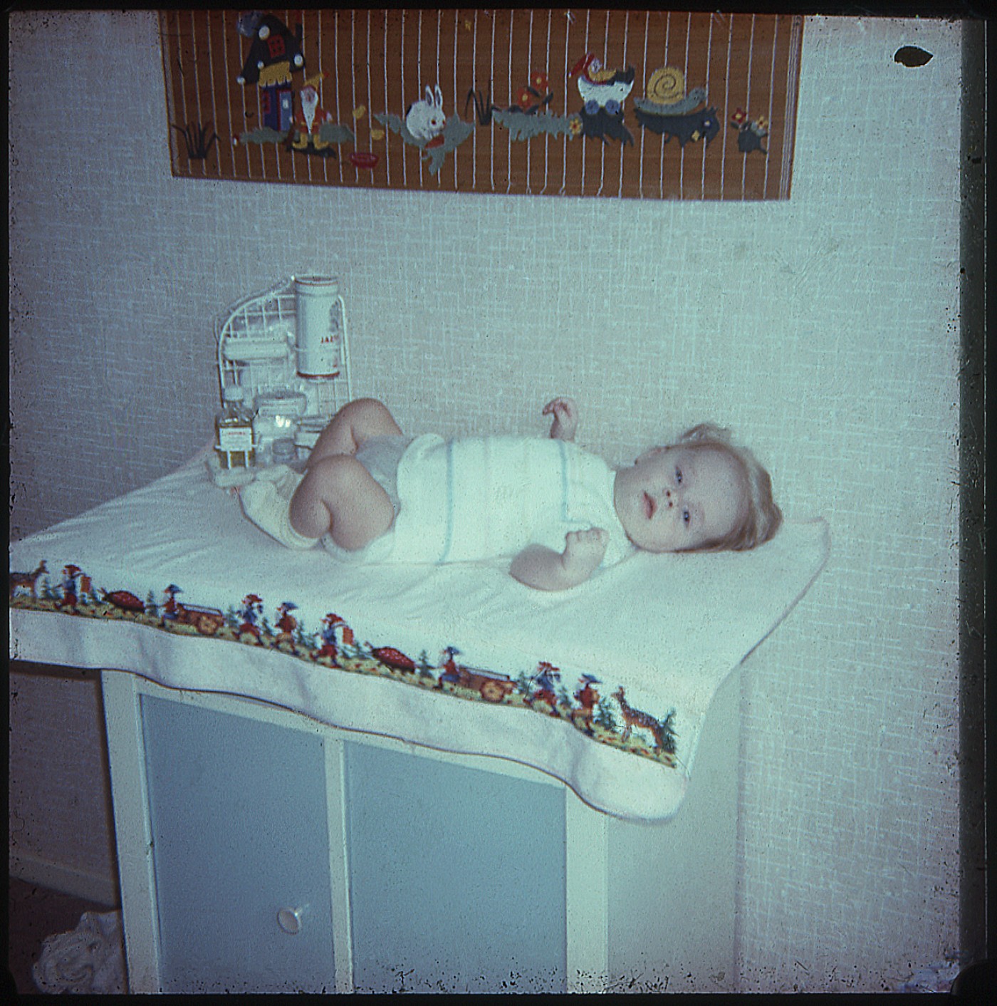 De verkleuring, het neutrale behang, het efficiënte Tomado-achtige opbergrekje en het plastic broekje doen aan de vijftiger jaren denken. De baby ligt op een geborduurd kleed met fantasiefiguren. Het zijn kabouters met karretjes die als een optocht aan ons voorbijgaat. Het oorspronkelijke patroon was kennelijk niet breed genoeg, sommige figuren komen twee keer voor.