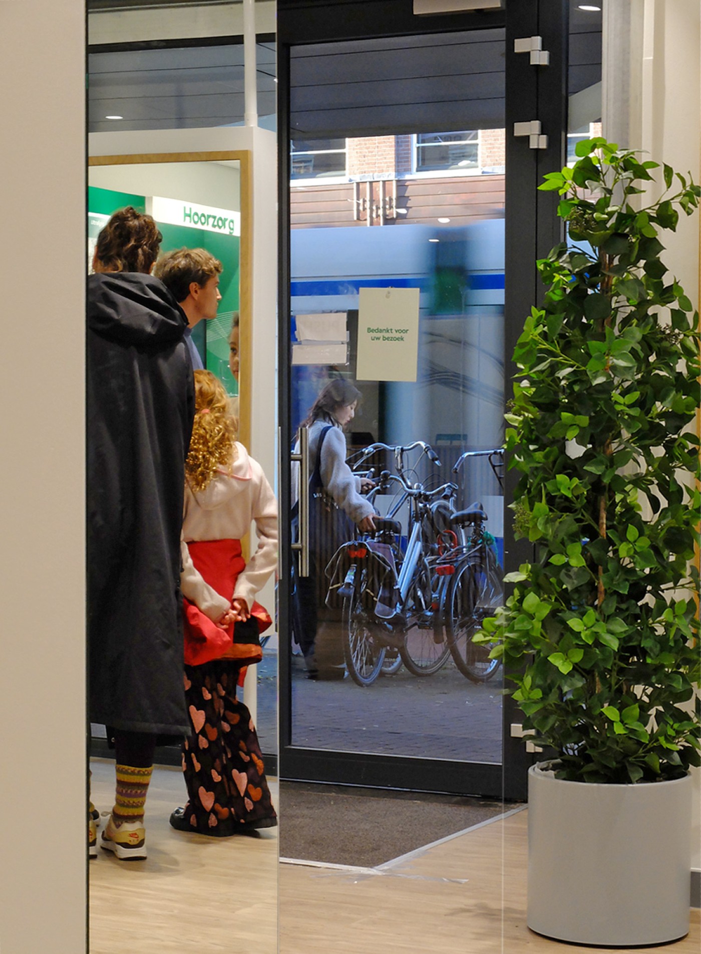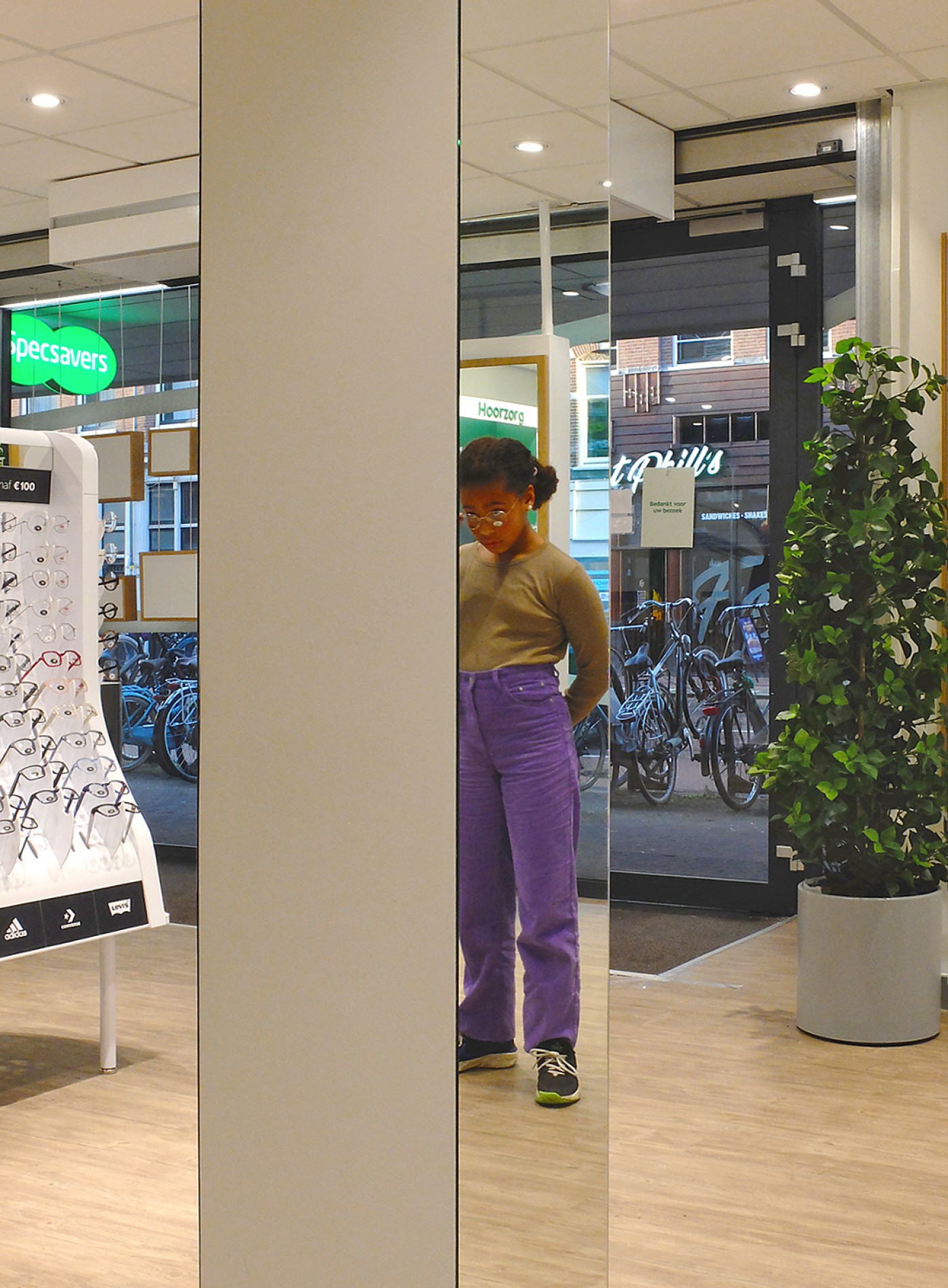 Misschien nog teveel bezig met reflecties uit de vorige blog, zag ik al weer andere mogelijkheden in die menging van spiegelbeelden en de realiteit, toen ik bij de firma Specsavers even moest wachten.