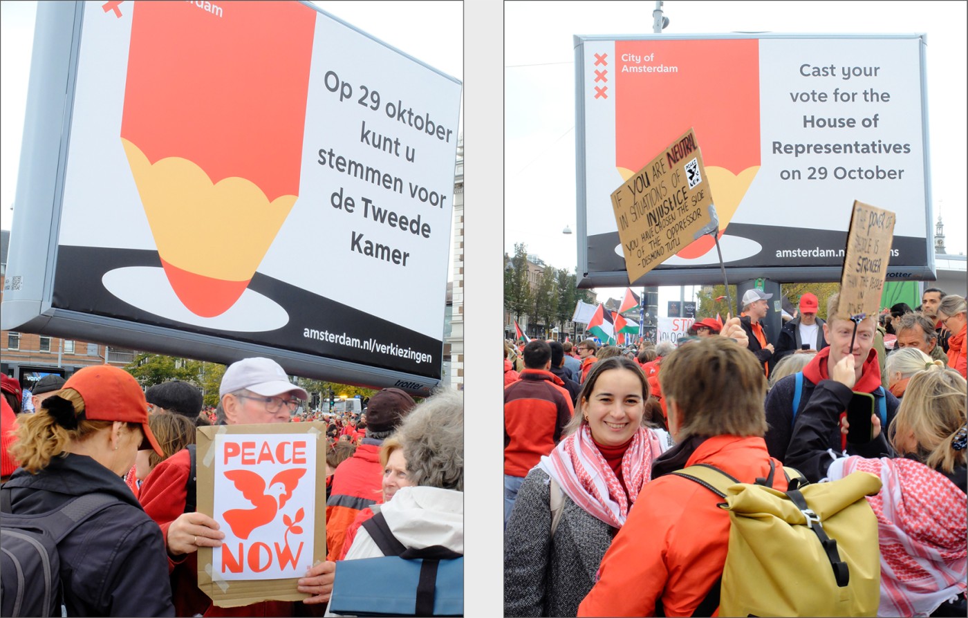 Altijd een beetje oppassen met teksten in een foto. Maar hier kon ik het toch niet laten. Zou een kwart miljoen stemmen een ommezwaai in het Israël-dossier teweeg kunnen brengen op de 29e?