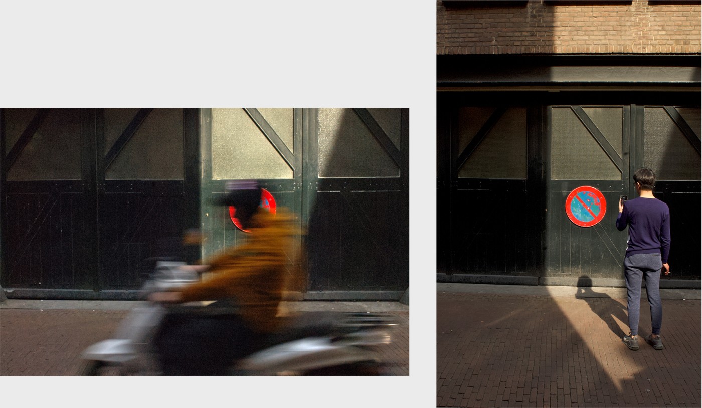 Daarom dat tweede plaatje. Waarom staat hier een man een foto van een verkeersbord te maken? Ik werd aangetrokken door de schaduwen en de baan licht op die plek, maar hij zoomde in op die rode cirkel zelf. Gelukkig voor mij vanuit een hoek die het bord vrij liet, zodat je het bord en deze man in één beeld had. Zijn schaduw, die lijkt op een afbeelding van de universele mens, kreeg ik cadeau.