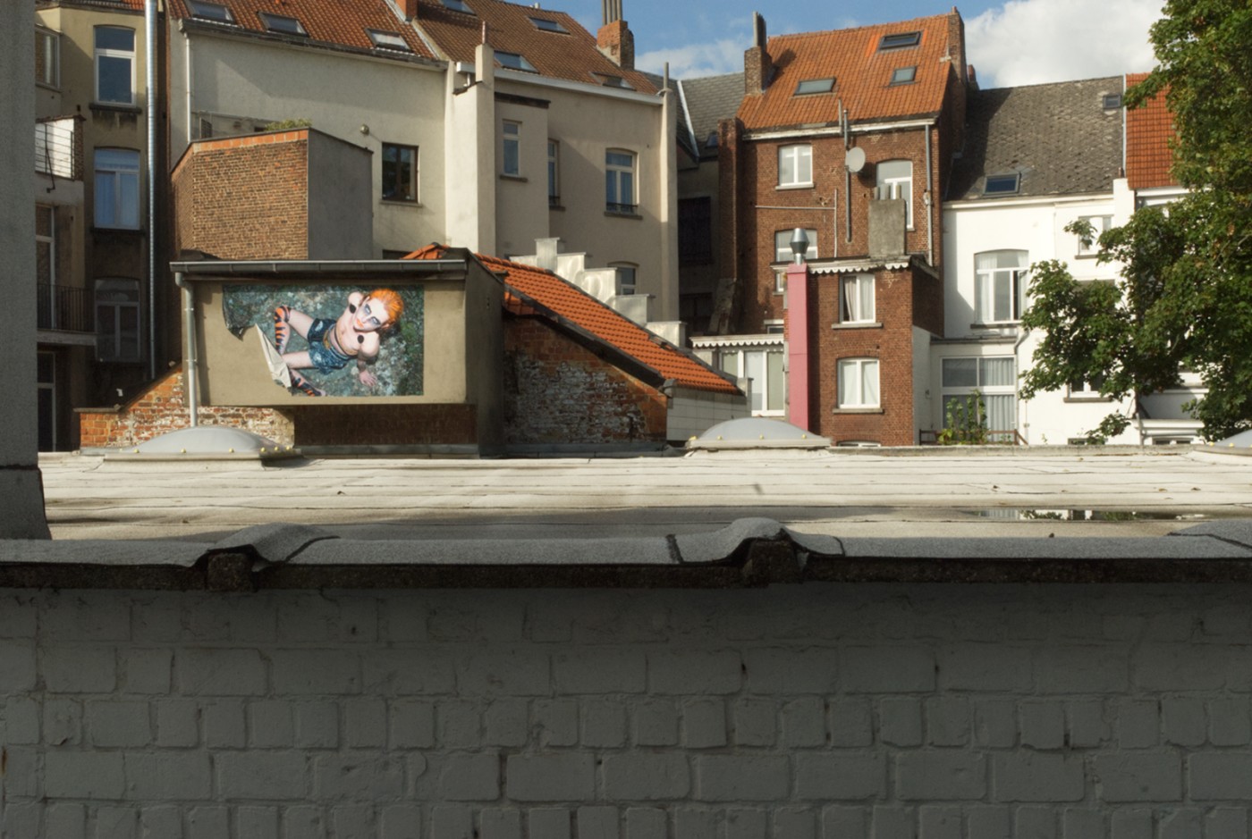 Brussel oktober 2021, uitzicht op de achterkant van de Hangargalerie waar Parr’s “Parraton” tentoonstelling hing. Het was verboden om binnen foto’s te maken. Je wilt wat met je inspiratie, gelukkig heb ik deze nog als herinnering. Ik heb ook nog foto’s van de standaard waar sokken aan hingen van de ‘Socksocial Club’ die hij ten bate van vluchtelingen verkocht.