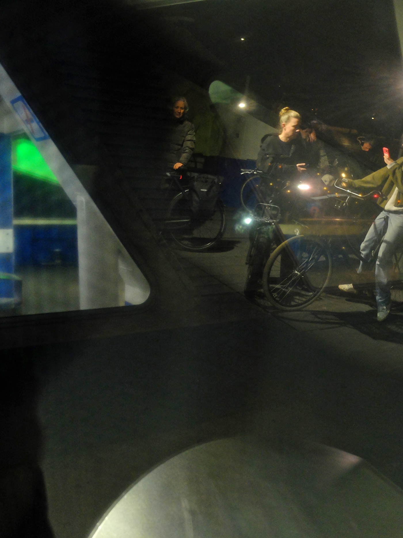 Ondertussen vliegt de achtergrond voorbij. Randen van daken of hoge boomtoppen schuiven het beeld in en verdwijnen weer. Om een vrij beeld te hebben moet ik even wachten tot we vlak voor station Hillegom wat weilanden zonder bomen passeren. Pas dan kan je de cirkelvorm van de binnenverlichting in onze coupée goed zien in de weerspiegeling op het raam.