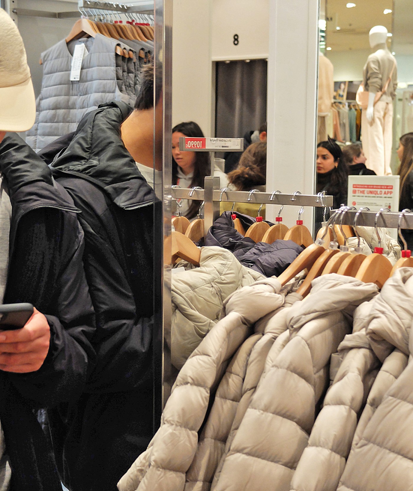 De foto is gemaakt in de winkel van de Japanse Uniqlo keten in de Kalverstraat. Maar op het Rokin kun je ook naar binnen. De inrichting vind ik altijd inspirerend, ik ken geen andere winkel waar zo nadrukkelijk gebruik is gemaakt van de hoogte. Alles lijkt hier hoog opgestapeld om toch maar zoveel mogelijk te laten zien. Je past er als publiek nog net tussen. Zo’n opgepakt gevoel verhoogt de saamhorigheid. Alsof iedereen hier op een koopje uit is. Alleen een foto met fragmenten van deze chaos doet daar recht aan.