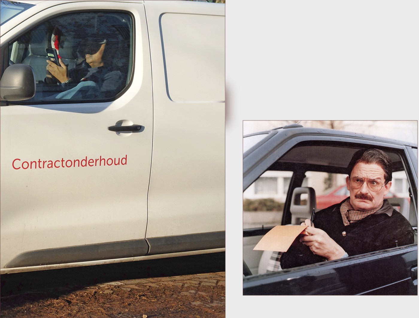 Gelukkig staat hier op de deur dat de inzittende zich met contractonderhoud bezighoudt.  Maar de laagstaande zon en de schaduw van een achteruitkijkspiegel zorgen voor een masker over z’n gezicht, zoals op foto’s van misdadigers met zwarte balkjes over hun ogen. Meteen daarna denk je dat er hier helemaal niet gewerkt wordt. Vast een illegale siësta, of gamen in de baas z’n tijd. Zou ik ook doen.