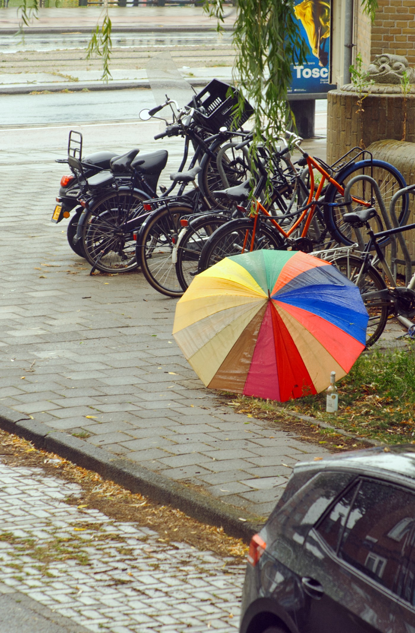 Als je van dit beeld uit zou gaan, zou het dan voldoende zijn om iets van dit verhaaltje te snappen? Een veelkleurige open paraplu en een lege fles ernaast. De elementen van alleen willen zijn en een fles drank wegwerken, zaten er wel in. Iemand had hier ‘s nachts op de grond iets moeten beslissen, was opgestaan en verder gegaan. Het waren de kleuren op die paraplu die me toch wat optimistisch stemden. Zeker met al die regenboogvlaggen in de buurt.