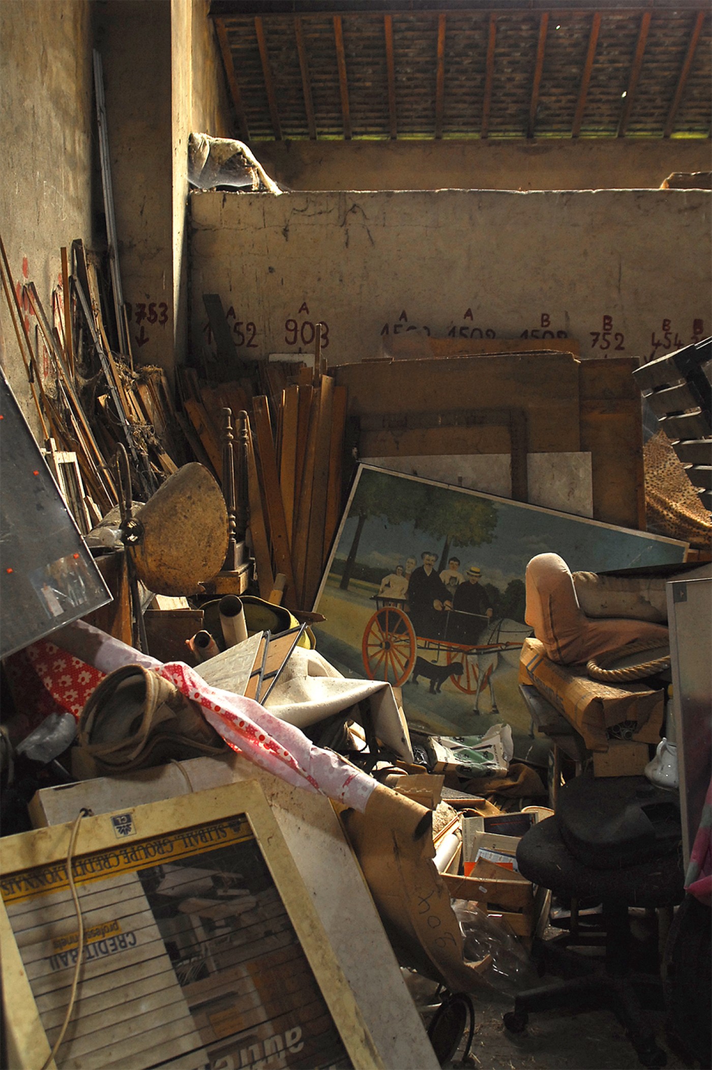 In een verlaten hal aan een zijweg, verscholen achter struikgewas, lag een verzameling verwaarloosde spullen onder een lekkend dak. Hier had iemand ooit een opslagplaats voor een bric à brac winkel willen beginnen, of een brocante; we zijn in Frankrijk. Door gaten in het dak viel het licht in stofstralen naar beneden alsof het kerkramen waren. Daardoor drongen details zonder veel betekenis zich naar voren en bleven belangrijker spullen in de duisternis. Caravaggio-romantiek. Zo’n half afgerolde rol rode bloemetjesstof maakte dit tafereel tot een onbedoeld klassiek stilleven.