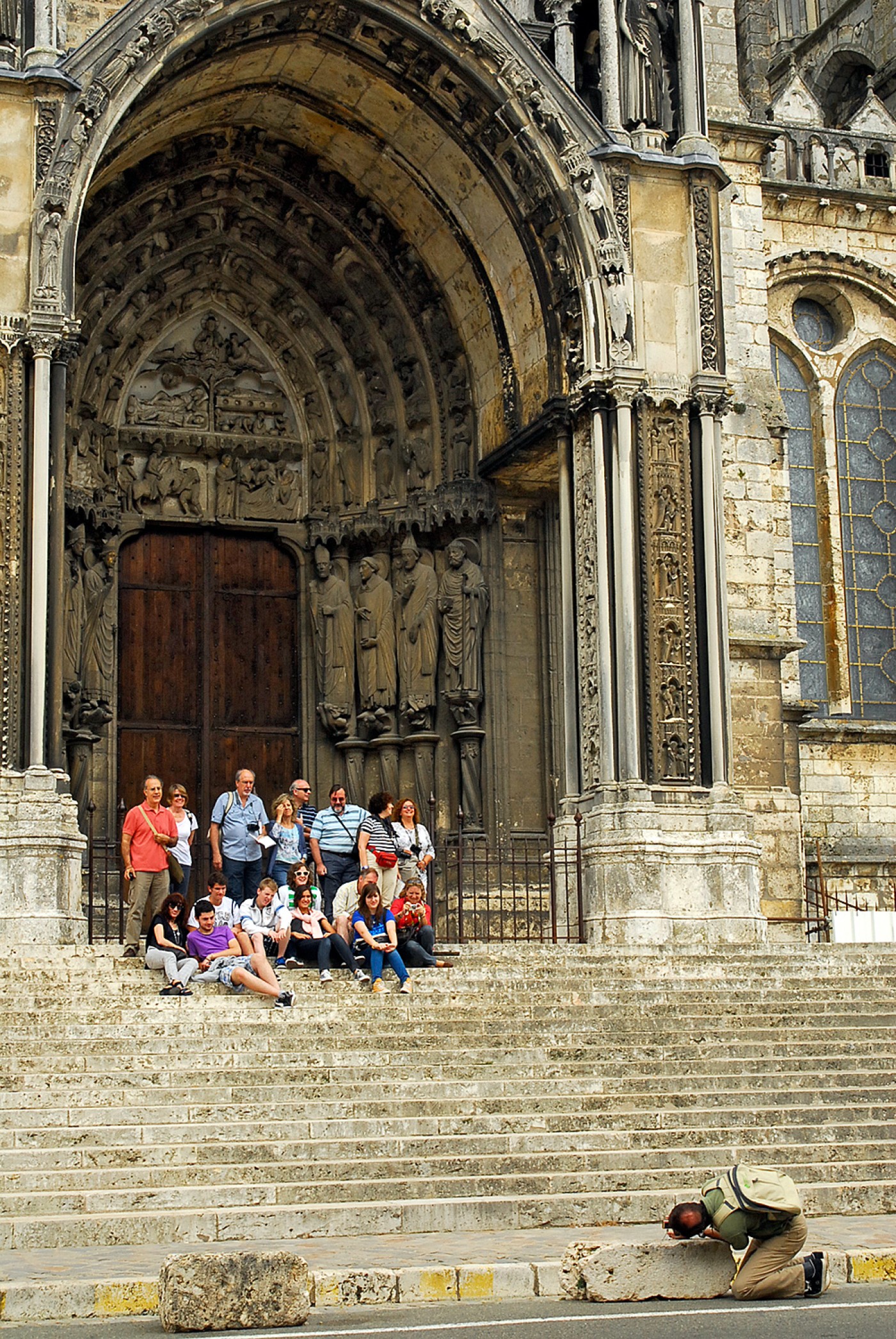 Achttien mensen hebben net de kathedraal van Chartres bezocht en willen er allemaal een herinnering aan. Gewoonlijk worden dan alle fototoestellen op één opnameplek gelegd en één lid van de groep maakt dan met ieders toestel dezelfde opname. Bij deze groep werd er maar één foto gemaakt die vast later naar iedereen gemaild zou worden.
